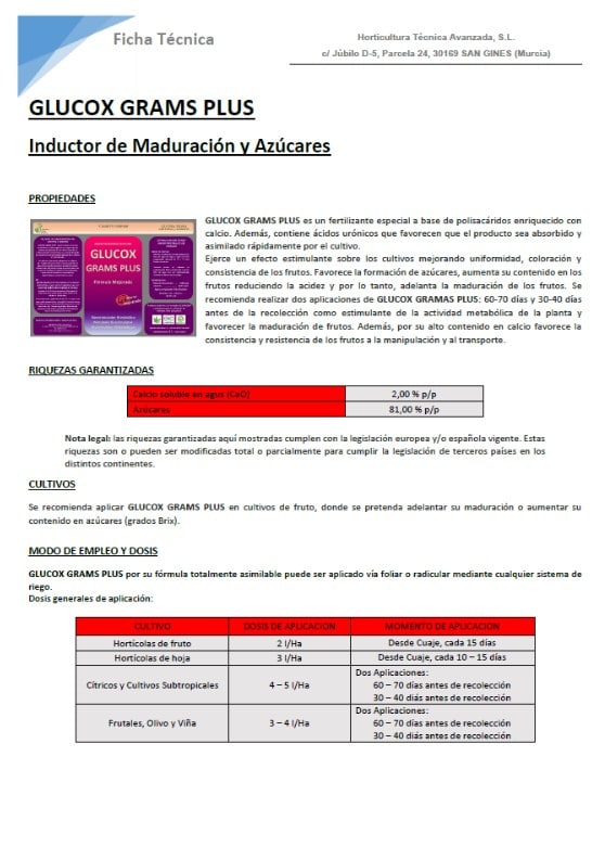 GLUCOX GRAMS PLUS está formulado a base de carbohidratos, ácidos orgánicos de origen vegetal y almidón que aplicados en las últimas fases de los cultivos producen en los frutos un aumento del grado de azúcares y la transformación del agua de su interior en masa pesada.