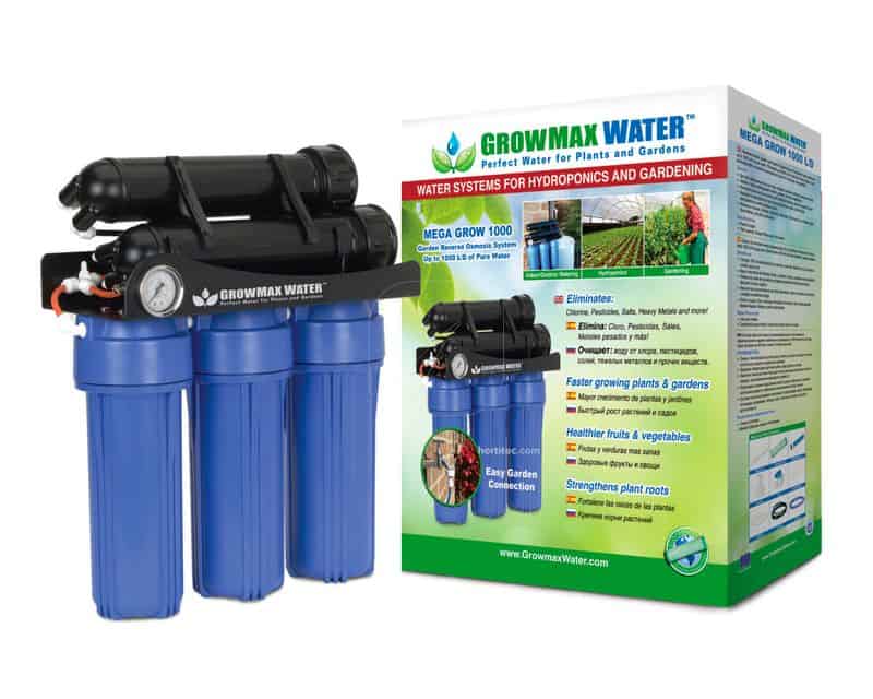 El sistema de ósmosis inversa Mega Grow produce hasta 1000 litros al día (hasta 40 litros por hora), ideal para cultivos medianos tanto en hidroponía como en jardinería.
